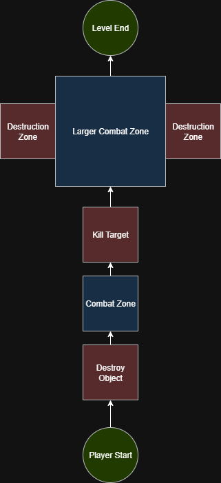 When concepting the level I created several node base designs to help me visualize the gameplay flow of the level. For the level in question I determined that a full linear level suited the desired game flow better as I intended to fully control the pacing of the mod taking the player on a journey of destruction through the facility.
