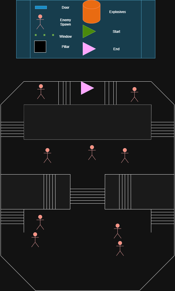 As the Severed Steel mod editor doesn't have a hierarchy view or multiple viewports / viewmodes. I only created a rough top down plan for each of the core combat area focusing an a agile workflow I used these plans as references when designing each of the areas but was sure to not remain 100% faithful to the original plans allowing myself breathing room to adapt the mods layout to be more fluid and fast paced.