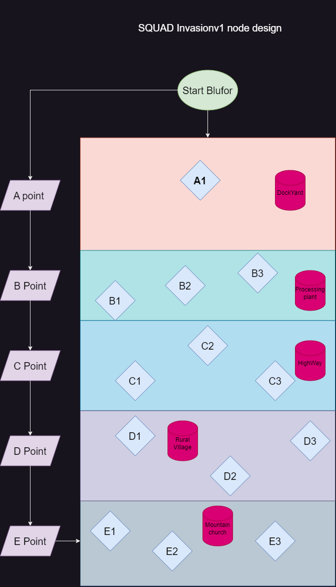 Node designs were made for the Invasion gamemode since this gamemode is by nature asymmetrical as one team will be defending pre-set positions while the attacking team only knows the objectives one at a time meaning they have to use strategy and tactics in order to circumnavigate the defenders advantage.
