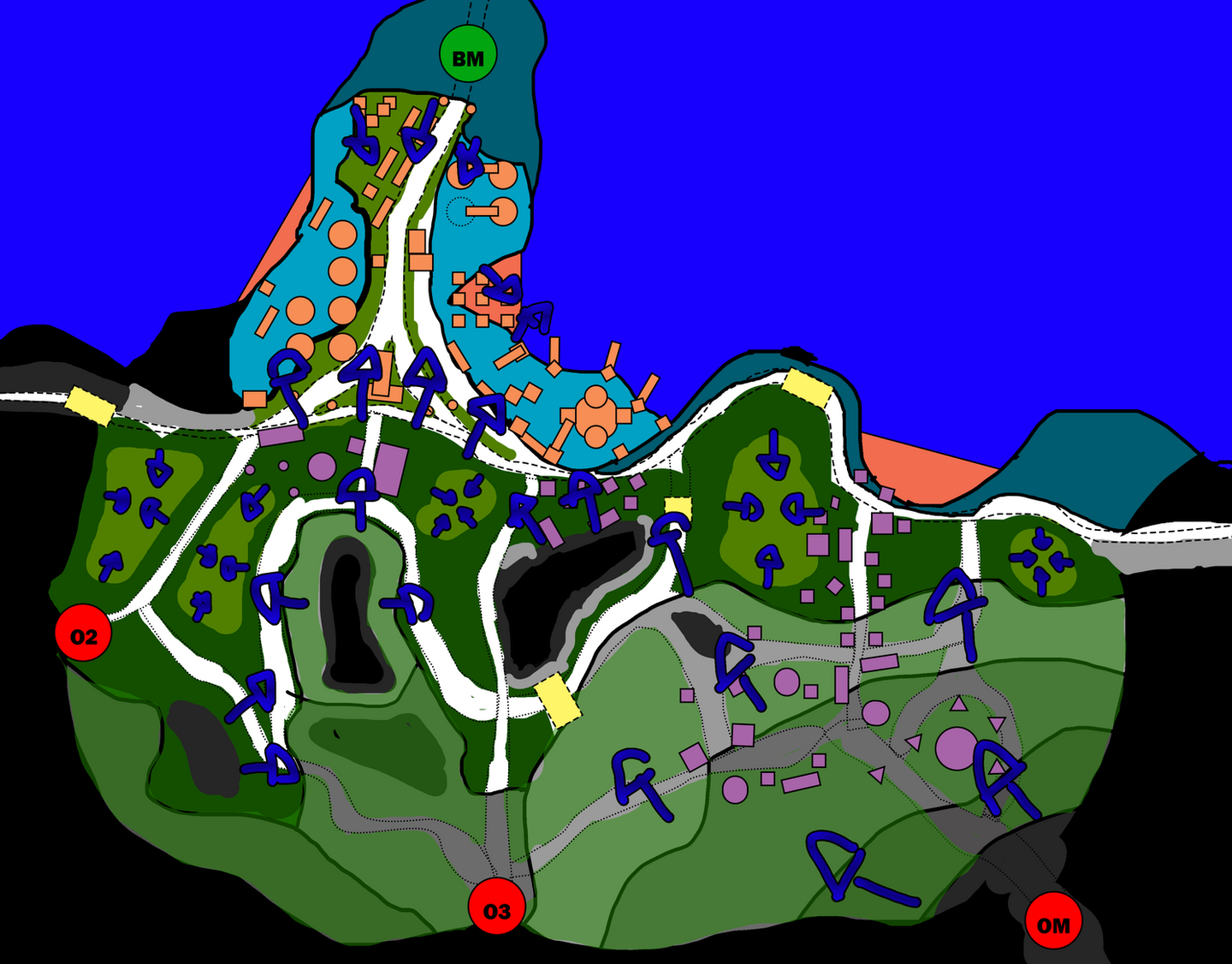 Each objective zone was planned so that gameplay can have numerous different routes the player can take to achieve the same objective which would in turn complement Squads existing gameplay rewarding teamwork and player choice. I then made rough plans for how players will progress from spawns and how their sight lines will be at certain areas allowing me to refer back to the document to determine whether it would be a good idea to block line of sight from certain locations